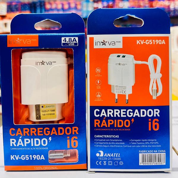 CARREAGADOR ( 4.8A ) PARA IPHONE ( I6 ), CABO PRESO NA FONTE. ( INOVA )