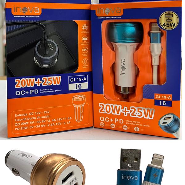 CARREGADOR DE CARRO TURBO ( 20W + 25W ) PARA IPHONE ( I6 ), ( USB ) E ( USB-C ). ( INOVA )