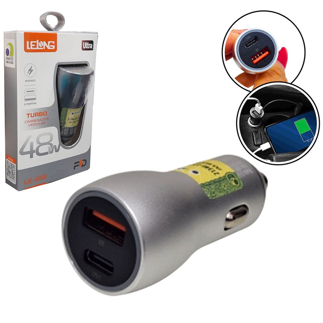 FONTE VEÍCULAR TURBO ( 48W ), ( USB + USB-C ). ( LELONG )