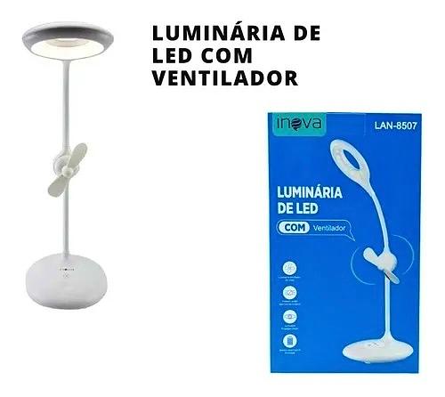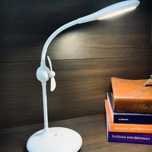 LUMINÁRIA DE MESA COM VENTILADOR RECARREGÁVEL. ( INOVA )